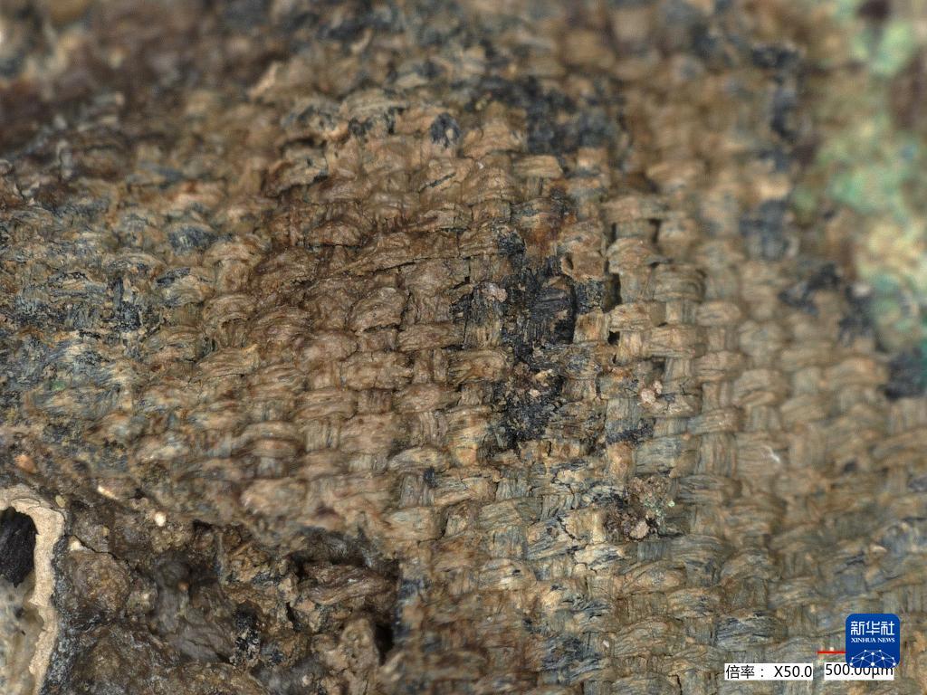 這是位于四川省廣漢市的三星堆祭祀區考古發掘現場8號“祭祀坑”青銅殘片上的絲綢殘留物。新華社發(四川省文物考古研究院供圖)
