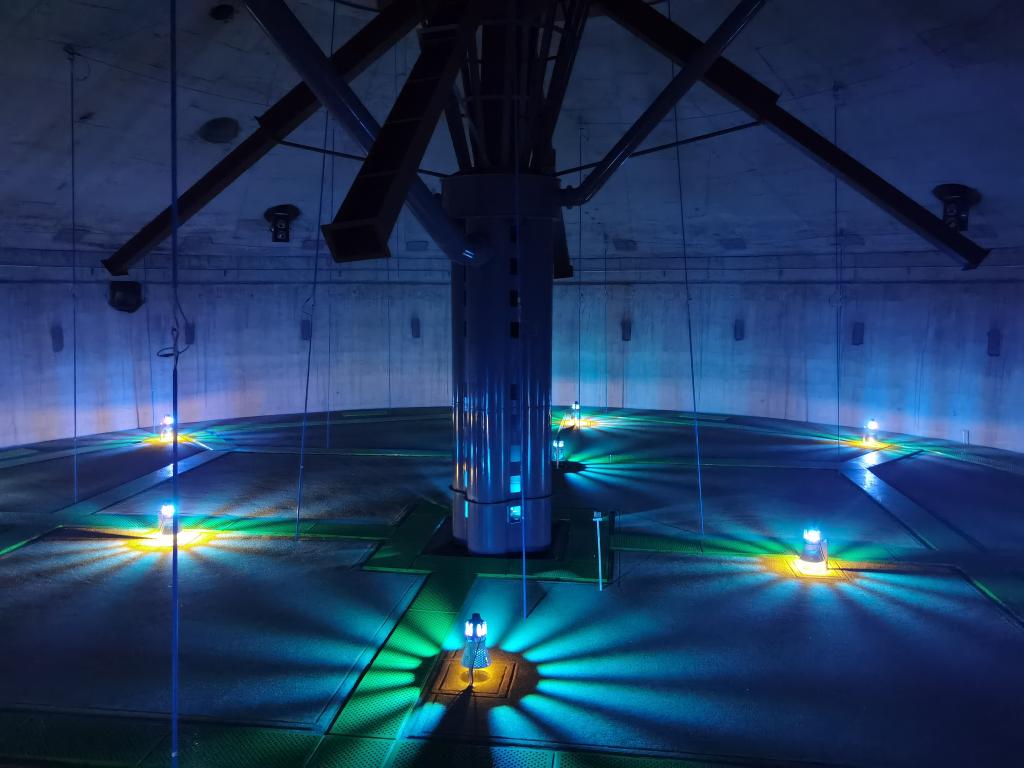 淺圓倉內(nèi),10盞藍(lán)色的多光譜紫光燈發(fā)出淡淡藍(lán)光,稻谷整齊而平坦地存放在幾大塊區(qū)域內(nèi)。“紫光燈可以很好地誘殺可能在糧倉出現(xiàn)的30多種害蟲。”該倉保管員閆科向記者介紹。