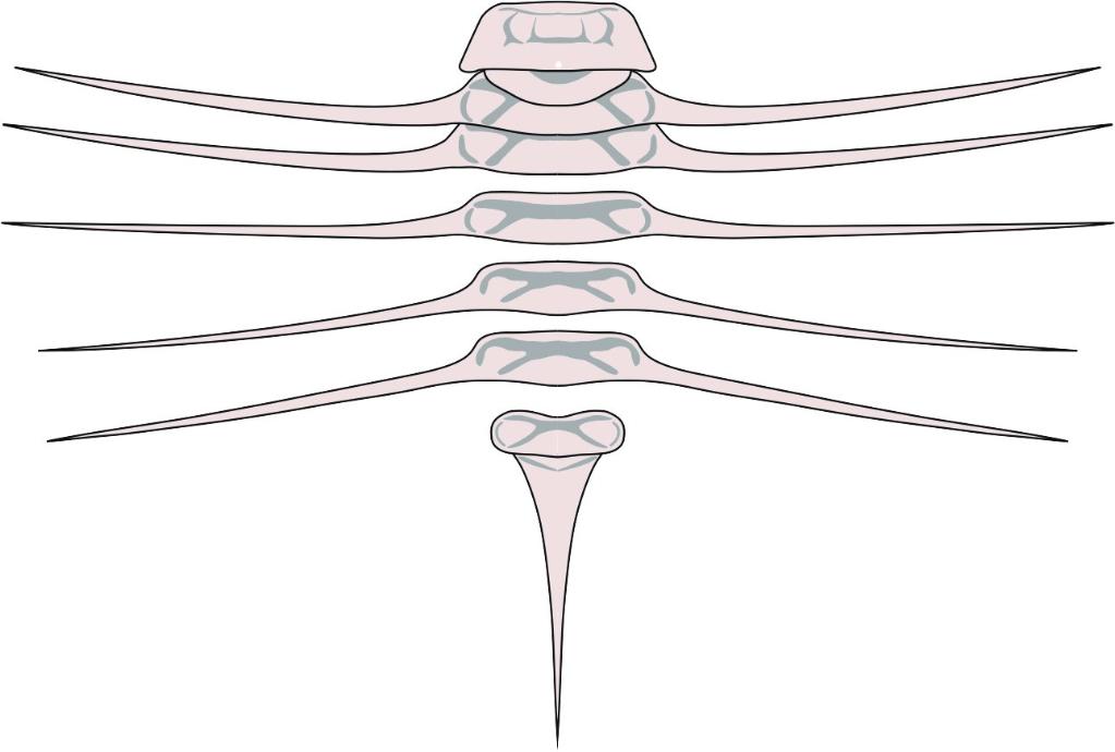 從形態(tài)上看,賽爾瑪爾迪布拉克蟲外觀奇特。它的身體分為多節(jié),且多個體節(jié)都向兩側伸出對稱的尖刺。它的尾部還拖著一條細長的尾刺,仿佛一只全身布滿了刺的“蟲”。