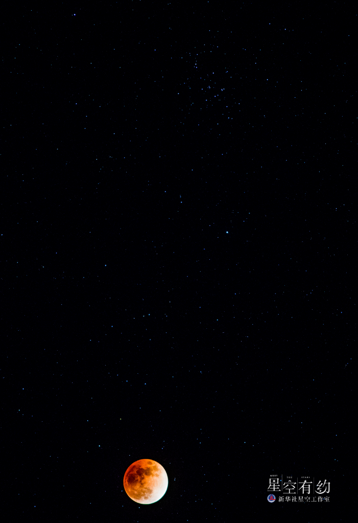 北京市天文攝影愛好者楊勇2018年2月3日在黑龍江省漠河市北紅村拍攝的月食與蜂巢星團。(本人供圖)