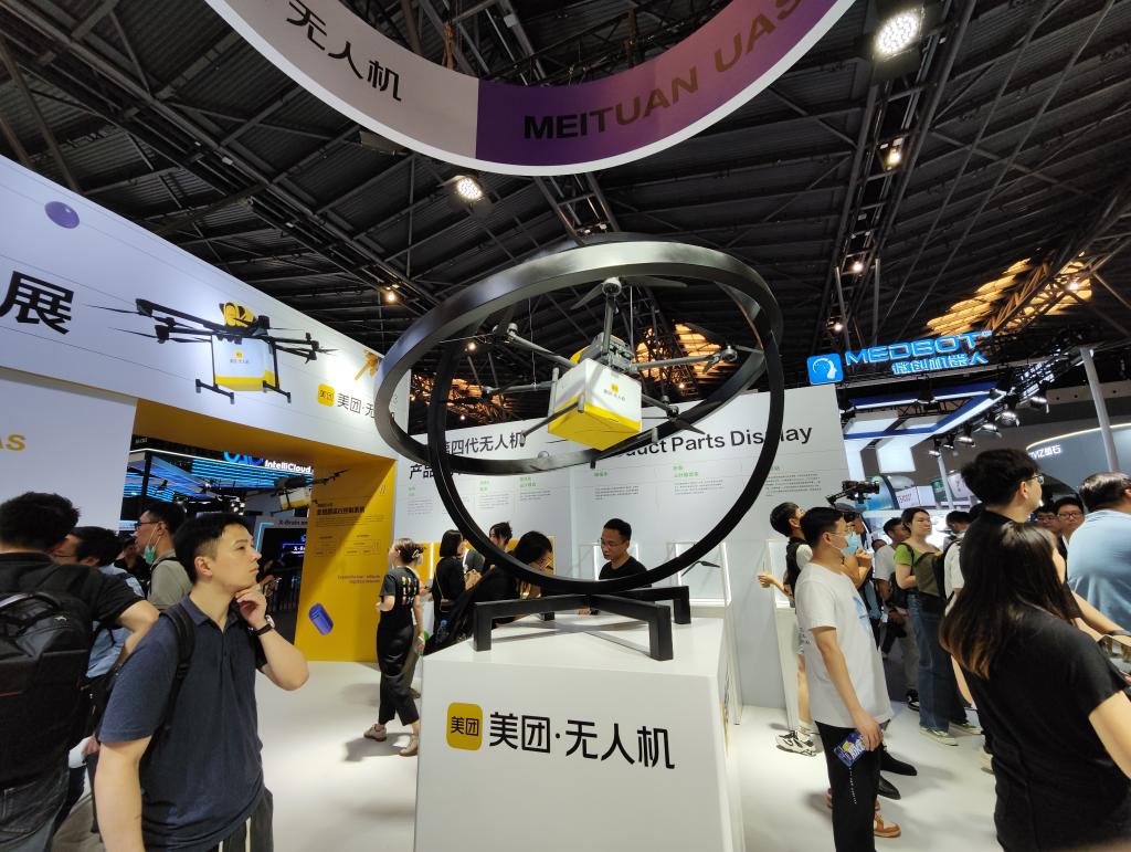 7月6日,世界人工智能大會(huì)展會(huì)現(xiàn)場(chǎng),美團(tuán)展示的第四代送餐無(wú)人機(jī)新機(jī)型。新華社記者 楊有宗 攝