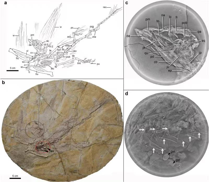 熱河鳥標本的線描、攝影和計算機分層掃描成像。(中國科學院古脊椎所供圖)