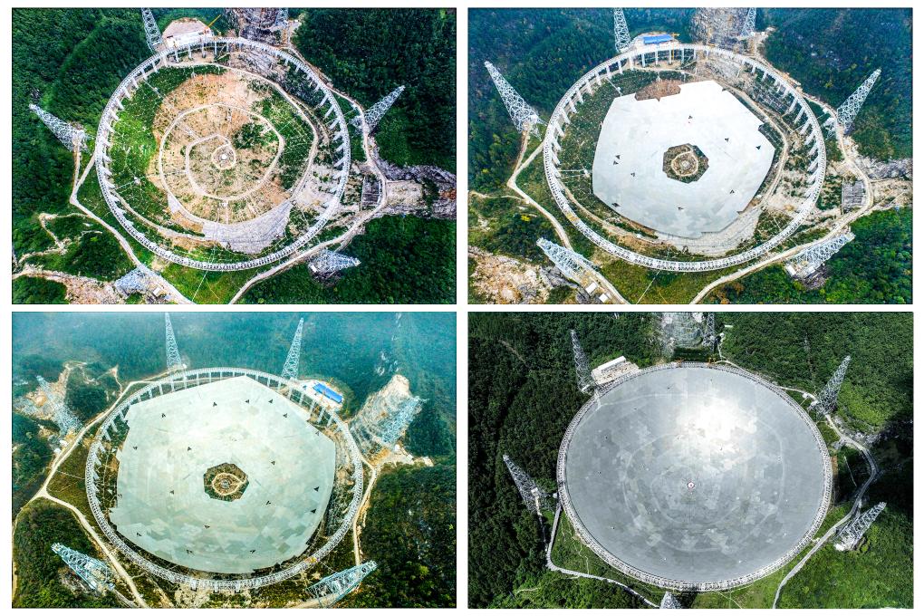 這是一張拼版照片:依次為“中國天眼”拼裝第一塊反射面板(左上,2015年8月攝)、“中國天眼”反射面板安裝近半(右上,2015年12月攝)、“中國天眼”反射面板安裝近八成(左下,2016年3月攝)、維護保養期間的“中國天眼”(右下,2022年7月攝)(無人機照片)。新華社記者 歐東衢 攝