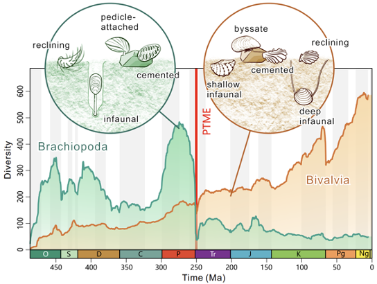 近5億年來腕足類與雙殼類的多樣性變化。大滅絕前腕足類的多樣性遠高于雙殼類,大滅絕后則相反。(陳中強教授團隊供圖)