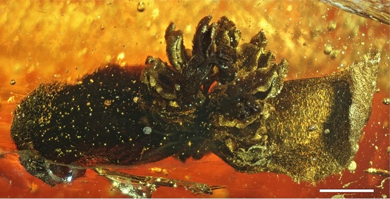 漳浦琥珀中的志炎銀縷梅雄花,比例尺1mm。(中國科學院南京地質古生物研究所供圖)