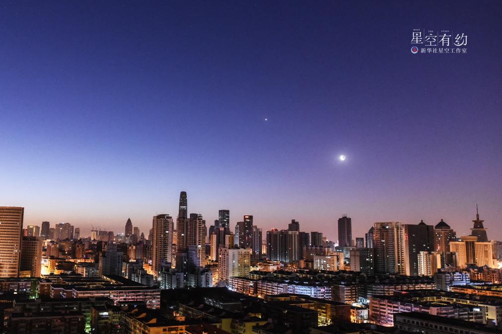 天津市天文攝影愛好者楊婧2022年2月27日黎明時分在天津市南開區拍攝的金星伴月。(本人供圖)