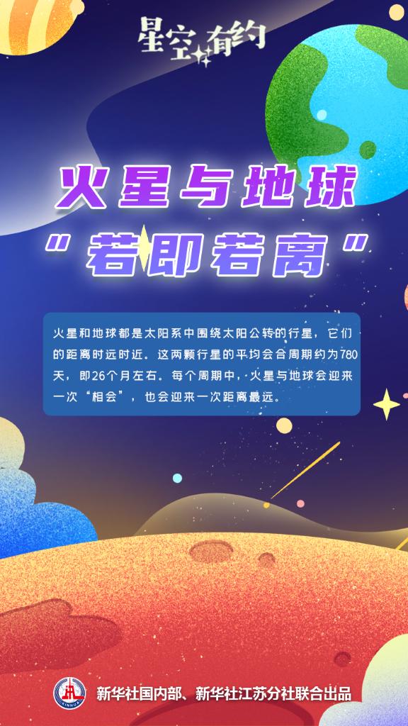 王科超介紹,火星和地球都是太陽系中圍繞太陽公轉(zhuǎn)的行星,它們之間的距離時(shí)遠(yuǎn)時(shí)近。這兩顆行星的平均會(huì)合周期約為780天,即26個(gè)月左右。每個(gè)周期中,火星與地球會(huì)迎來一次“相會(huì)”,也會(huì)迎來一次距離最遠(yuǎn)。本輪會(huì)合周期里,火星已于2022年12月1日運(yùn)行至距離地球最近的位置,當(dāng)時(shí)與地球距離約為0.54個(gè)天文單位。