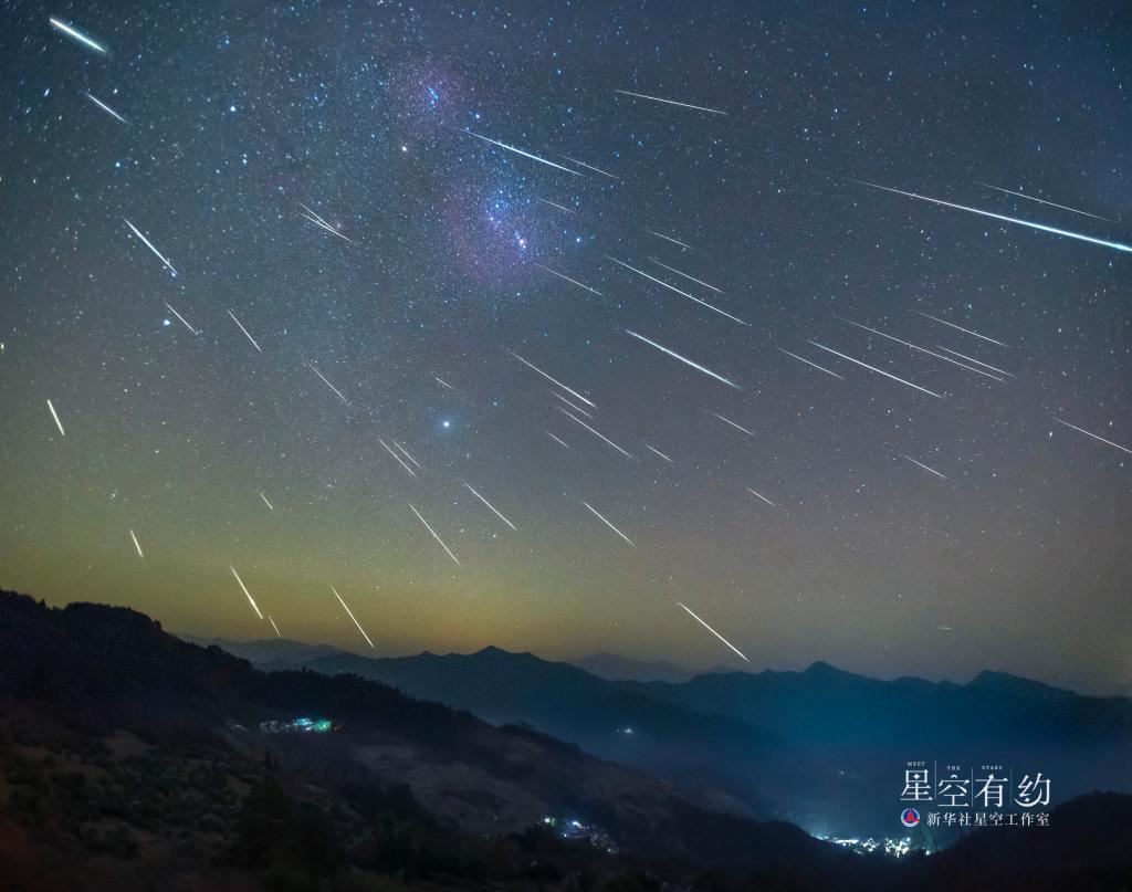 安徽星空攝影愛好者王藝胤2022年12月14日在安徽黃山市歙縣石潭村拍攝的雙子座流星雨(多張疊加)。(本人供圖)