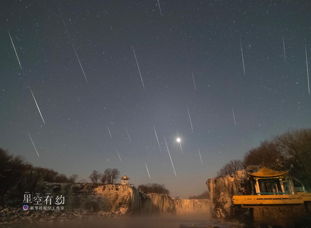 黑龍江星空攝影愛好者王寶勛2022年12月14日在黑龍江牡丹江鏡泊湖景區拍攝的雙子座流星雨(多張疊加)。(本人供圖)