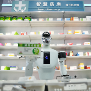 2025年6月17日,在北京经开区的机器人大世界,银河通用的具身大模型机器人盖博特Galbot进行药店无人值守场景演示。新华社记者 郑焕松 摄