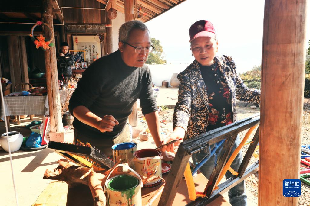 來自臺灣的“藝術(shù)鄉(xiāng)建”專家吳立行(左)在浙江寧海駱家坑村指導村民打造駱家小院(資料照片,2020年11月11日攝)。新華社發(fā)