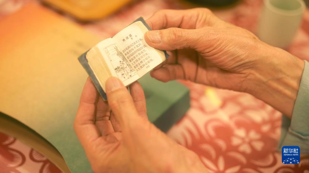 黃永松展示隨身攜帶的袖珍版《唐詩三百首》(3月29日攝)。新華社記者 黃揚(yáng) 攝