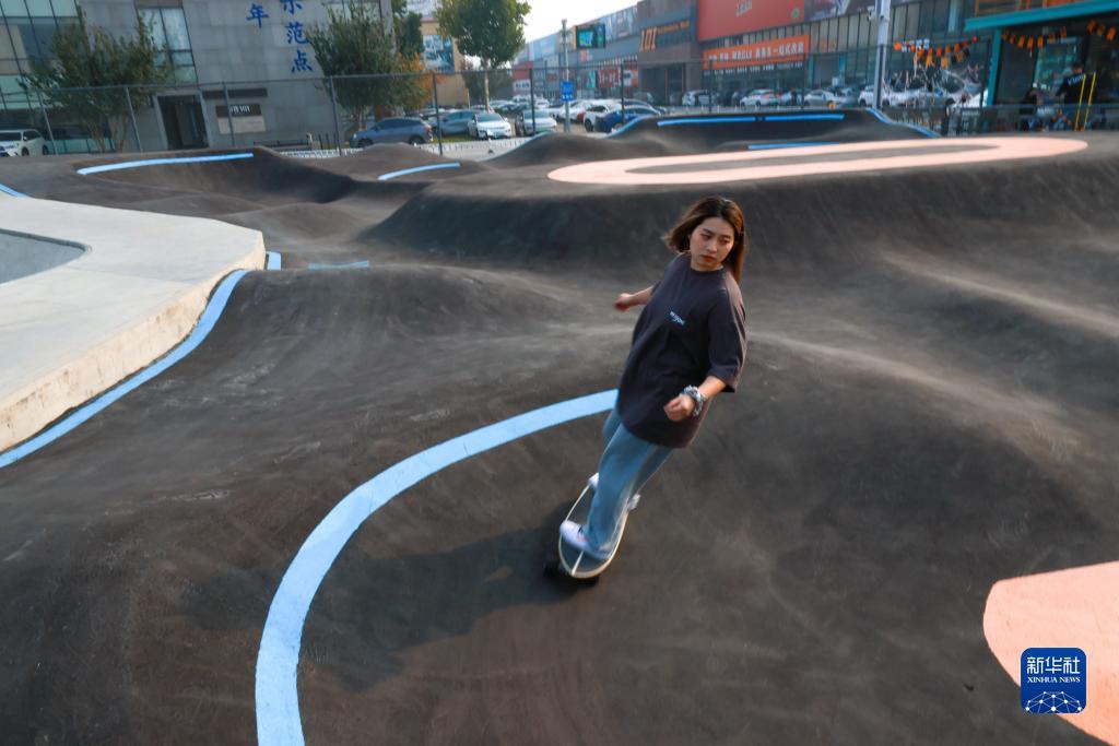 戴瑋萱在天津市西青區一處滑板公園的泵道上滑行(10月28日攝)。新華社記者 孫凡越 攝