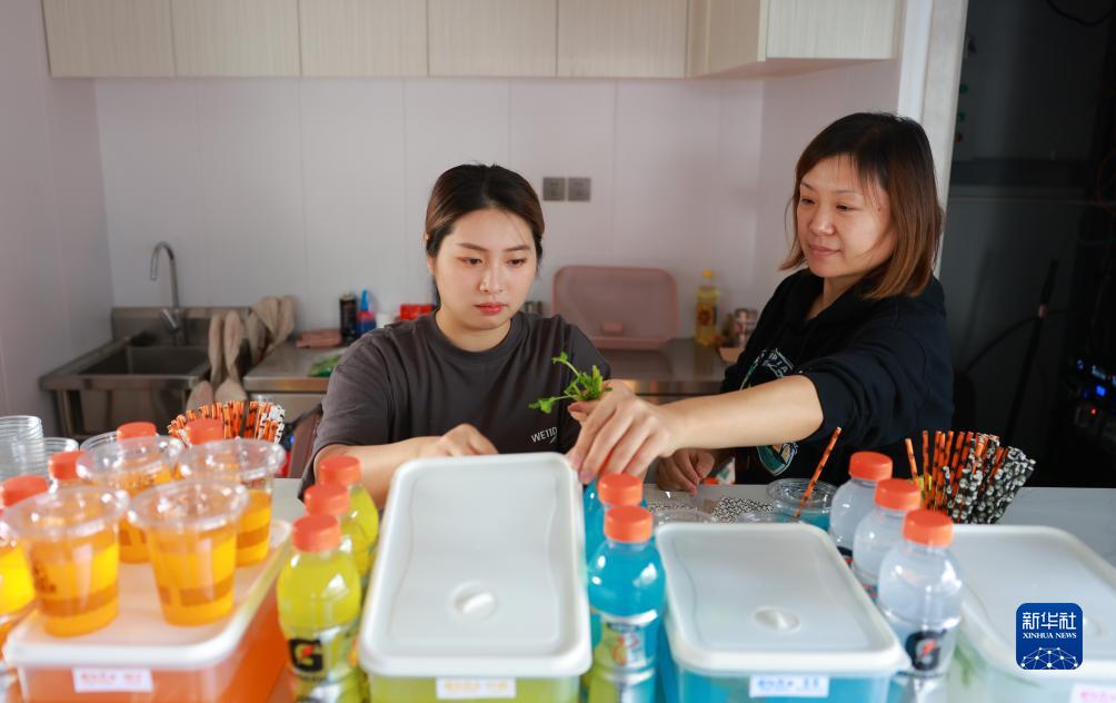 在天津市西青區一處滑板公園,戴瑋萱(左)為即將到來的滑板愛好者準備飲品(10月28日攝)。新華社記者 孫凡越 攝