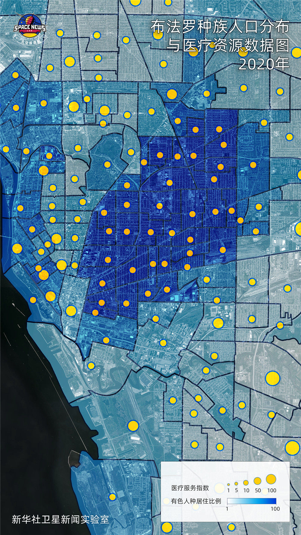 在這張根據Open Street Map開源數據制作的數據地圖中,黃色圓點越大,代表區域內人均可獲得的醫療資源越多。實際上,僅看分布密度,有色人種社區就與白人社區存在明顯差異。
