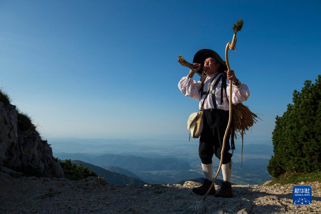 9月8日,斯洛文尼亞維利卡普拉尼那高地的老牧民彼得身著傳統服飾在吹牛角號。