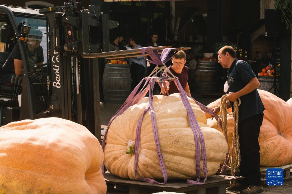 9月12日,在德國洛馬爾傳統(tǒng)南瓜節(jié)上,工作人員用鏟車給一個(gè)南瓜稱重。
