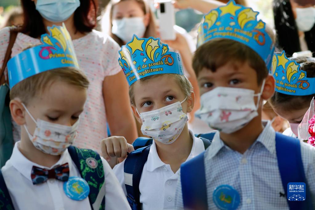 9月13日,在羅馬尼亞首都布加勒斯特,學(xué)生等待新學(xué)期開學(xué)典禮。當(dāng)日,羅馬尼亞全國(guó)中小學(xué)開學(xué),由于疫情日趨嚴(yán)重,政府要求所有人員必須戴口罩。
