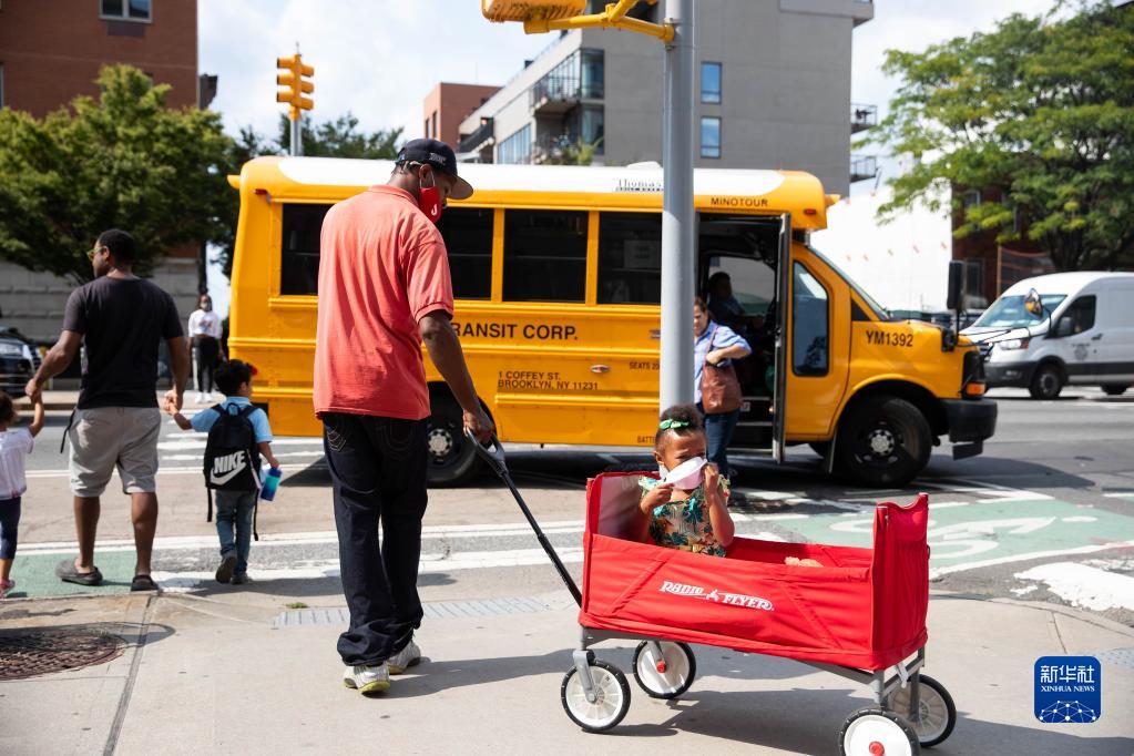 9月13日,家長在美國紐約一所公立學校外接學生放學。當日,紐約市公立中小學新學年開學,并全面恢復在校教學。