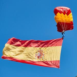 10月12日,一名傘兵在西班牙首都馬德里的國慶日慶祝活動上展示國旗。