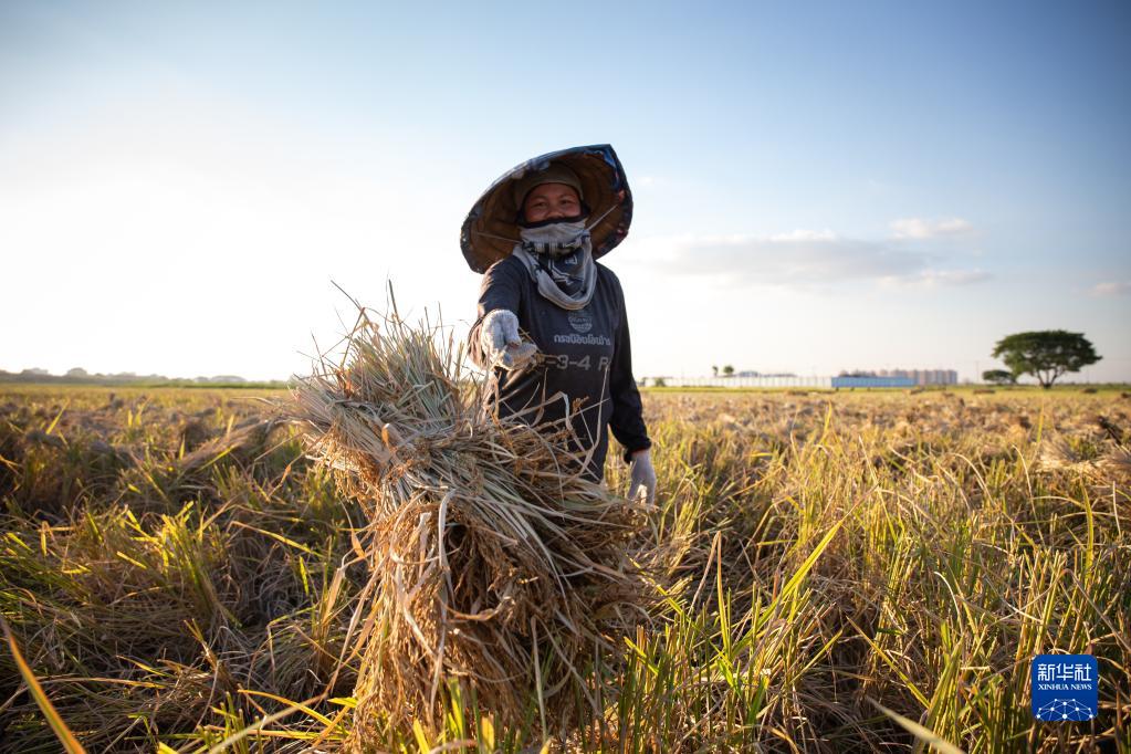10月25日,農民在老撾萬象城邊的田地里收割稻谷。