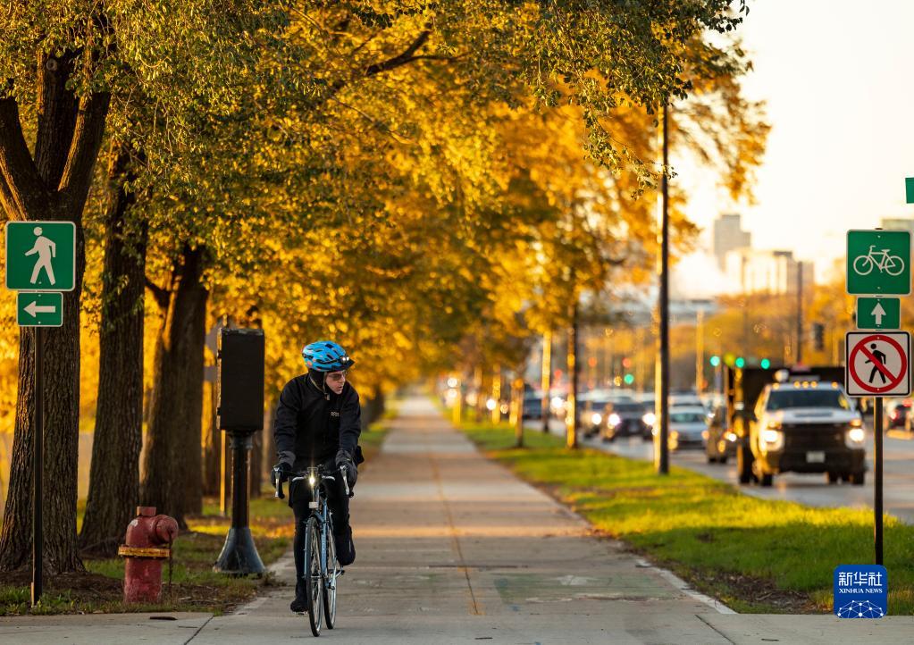 11月2日,一名男子在美國芝加哥湖邊小道騎行。