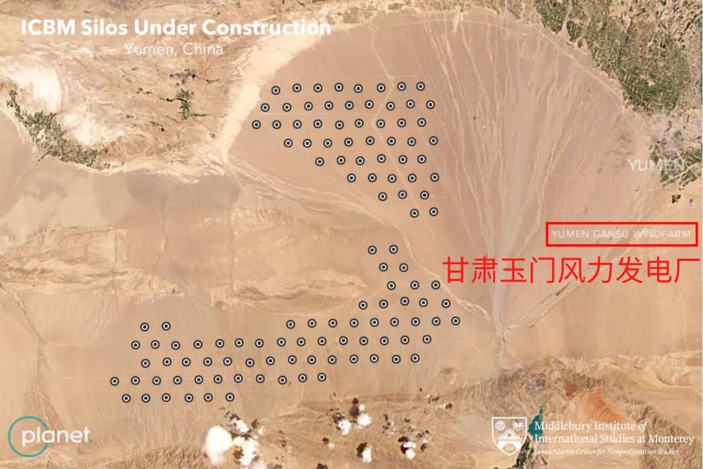 實際上,這些報道剛剛發出,就立刻遭到“打臉”。很多人發現,這些所謂“發射井”的旁邊,清楚寫著“甘肅玉門風力發電廠(YUMEN GANSU WINDFARM)”的英文文字水印。甚至有人放大這一地點的衛星圖片后,一排排風力發電塔和地上的影子都清晰可見。