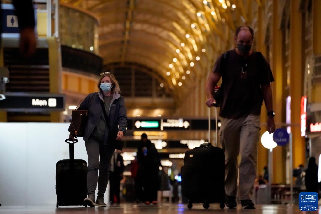 11月8日,在美國弗吉尼亞州阿靈頓的里根國家機場,旅客戴著口罩走在航站樓里。