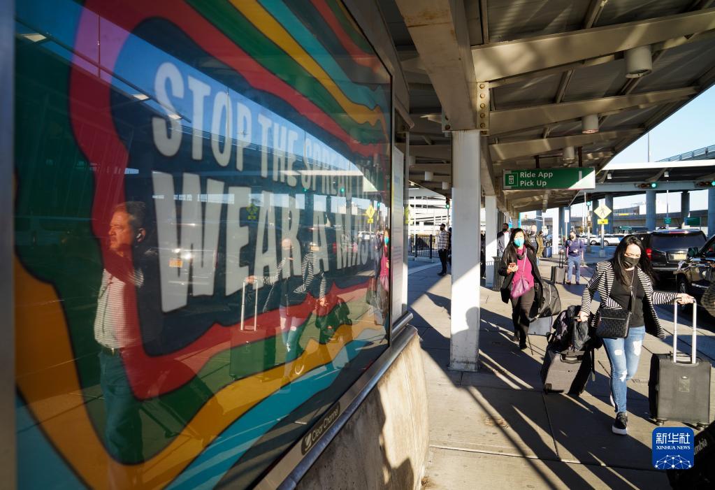 11月8日,在美國紐約肯尼迪國際機場,旅客從寫著“戴上口罩 阻斷傳播”的廣告牌旁走過。
