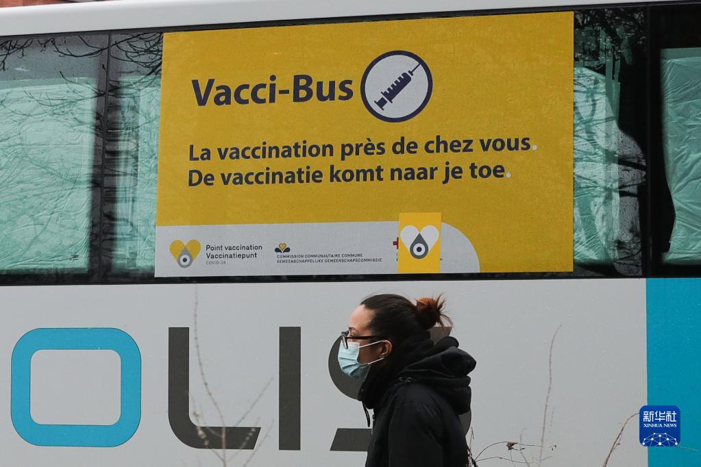 11月30日,一名女子經過比利時布魯塞爾的一輛新冠疫苗接種巴士。