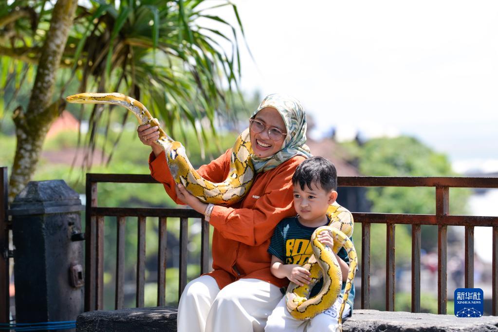 12月18日,在印度尼西亞巴厘島,游客在海神廟景區留影。
