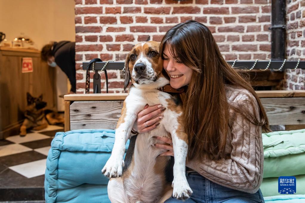 12月22日,在法國北部城市里爾名為Waf Cafe的咖啡館,顧客與狗狗互動。