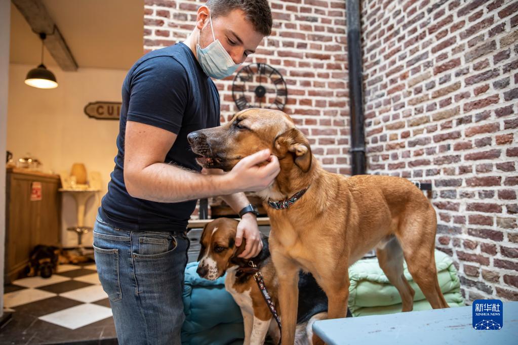 12月22日,在法國北部城市里爾名為Waf Cafe的咖啡館,顧客與狗狗互動。