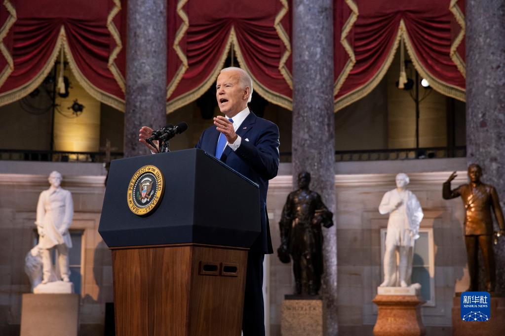 1月6日,美國(guó)總統(tǒng)拜登在華盛頓國(guó)會(huì)大廈發(fā)表講話,紀(jì)念國(guó)會(huì)山騷亂事件一周年。