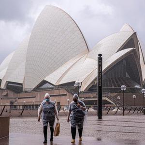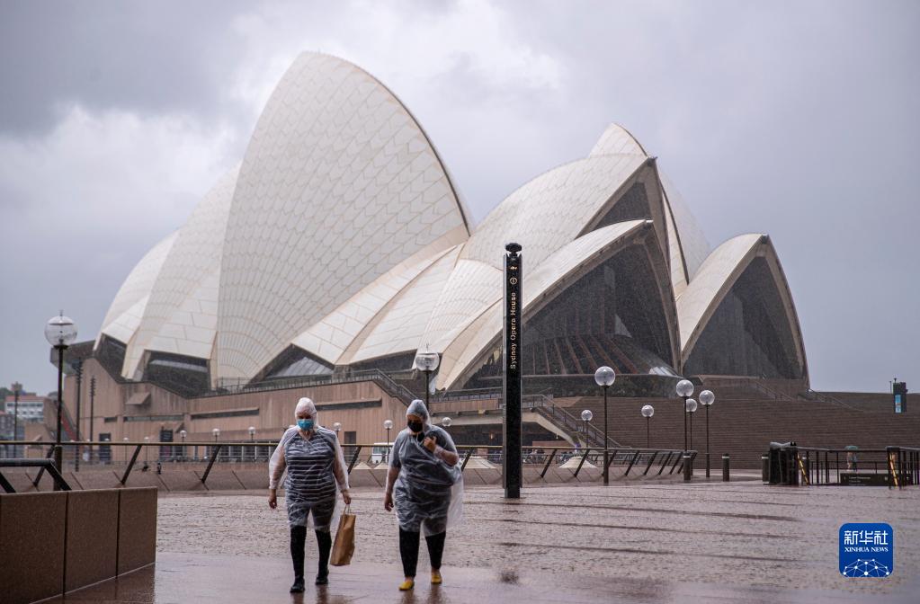 1月9日,兩名女子在雨中走過澳大利亞悉尼歌劇院。