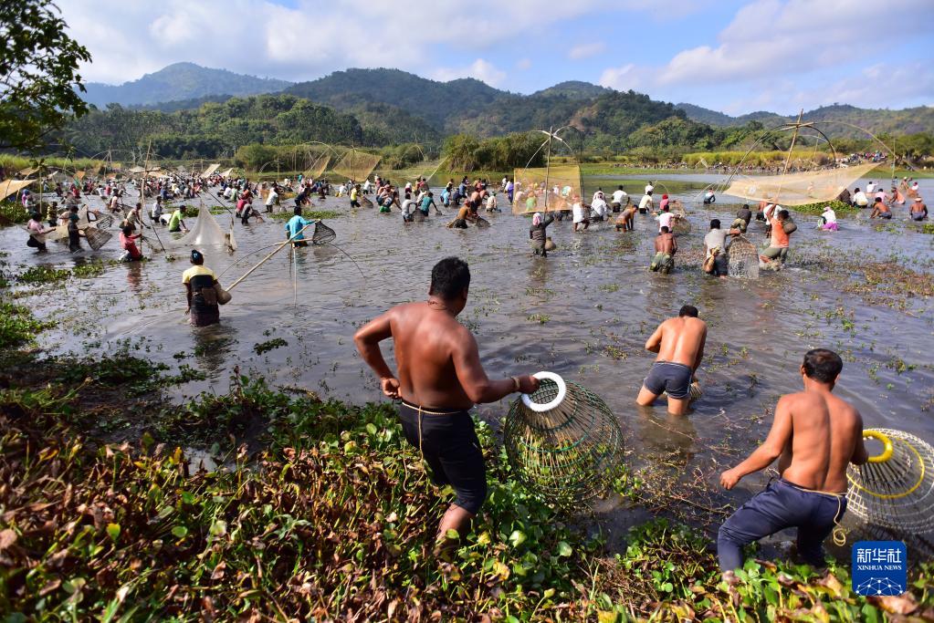 1月13日,在印度阿薩姆邦高哈蒂一處村莊,當地村民參加捕魚活動,慶祝收獲季的結束。新華社發