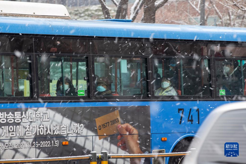 1月19日,在韓國首爾,乘客觀看車窗外的降雪。