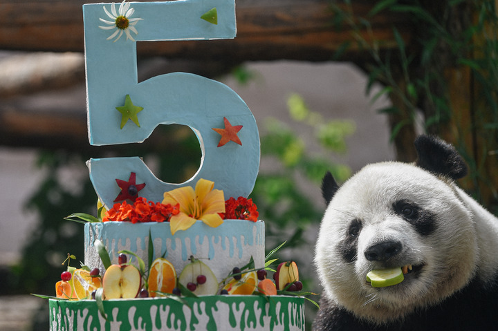 2021年7月31日,在俄羅斯莫斯科動(dòng)物園,大熊貓“如意”享用工作人員為它準(zhǔn)備的“生日蛋糕”。新華社發(fā)(葉甫蓋尼·西尼岑攝)