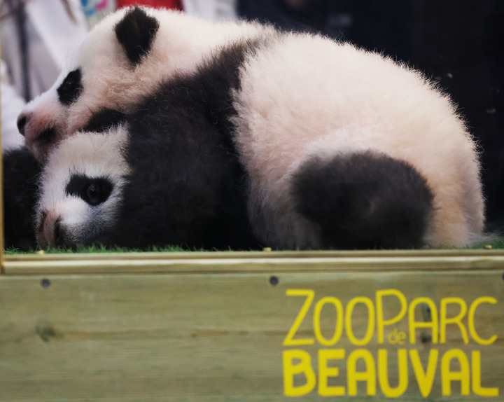 這是2021年11月18日在法國中部圣艾尼昂市博瓦勒野生動(dòng)物園熊貓館拍攝的命名儀式上的大熊貓雙胞胎。新華社記者 高靜 攝