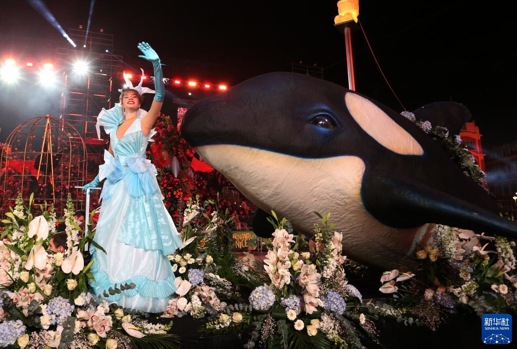 這是2月12日在法國南部城市尼斯拍攝的狂歡節花車夜間游行現場。