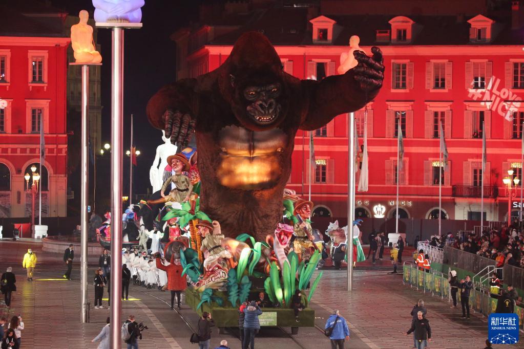 這是2月12日在法國南部城市尼斯拍攝的狂歡節花車夜間游行現場。