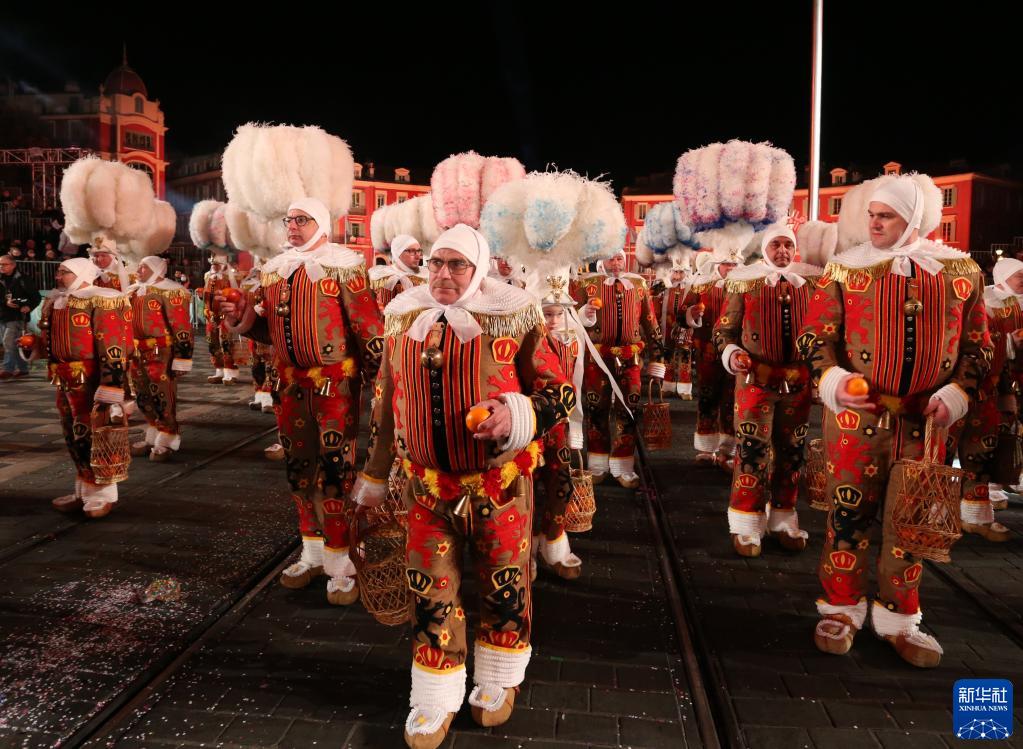 這是2月12日在法國(guó)南部城市尼斯拍攝的狂歡節(jié)花車夜間游行現(xiàn)場(chǎng)。