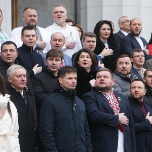 2月16日,在烏克蘭首都基輔,議員們在最高拉達(議會)門前的憲法廣場參加團結日慶祝活動。