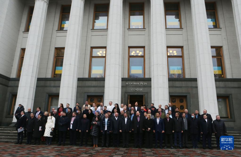 2月16日,在烏克蘭首都基輔,議員們在最高拉達(議會)門前的憲法廣場參加團結日慶祝活動。