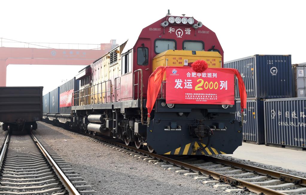 2021年12月8日,在合肥北站物流基地,第2000列合肥中歐班列即將啟程。(新華社記者周牧攝)