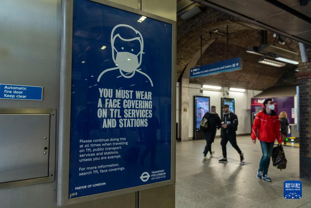 2月21日,在英國(guó)倫敦,人們經(jīng)過地鐵內(nèi)要求佩戴口罩的告示。
