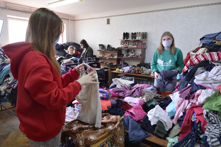 2月22日,在俄羅斯羅斯托夫州一處臨時安置點,工作人員整理衣物。新華社發(安德烈攝)