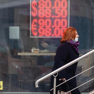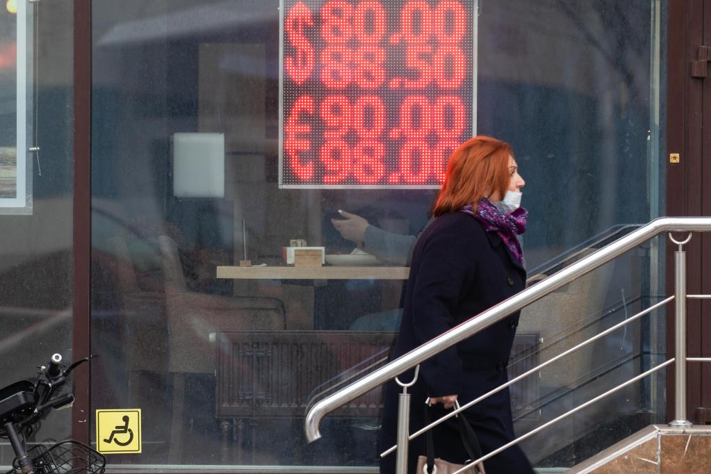 2月24日,在俄羅斯首都莫斯科,一名女子經過一家外匯兌換點的匯率顯示屏。莫斯科證券交易所當日的數據顯示,在俄總統普京宣布決定在頓巴斯地區發起特別軍事行動后,俄羅斯本幣盧布匯率暴跌。(新華社記者白雪騏攝)
