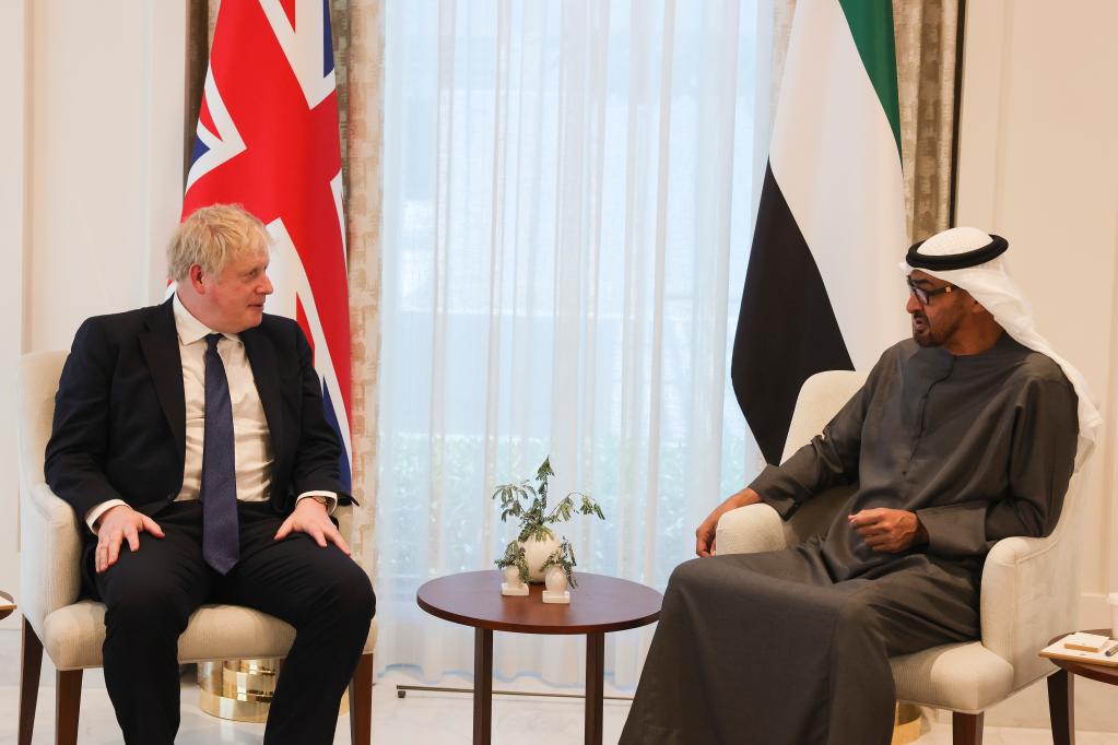 2022年3月16日,在阿聯酋首都阿布扎比,阿聯酋阿布扎比王儲穆罕默德·本·扎耶德·阿勒納哈揚(右)與英國首相鮑里斯·約翰遜舉行會晤。新華社發(英國首相府供圖)