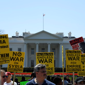 2018年4月14日,在美國華盛頓白宮北側,人們手持標語抗議對敘利亞進行軍事打擊。新華社記者楊承霖攝